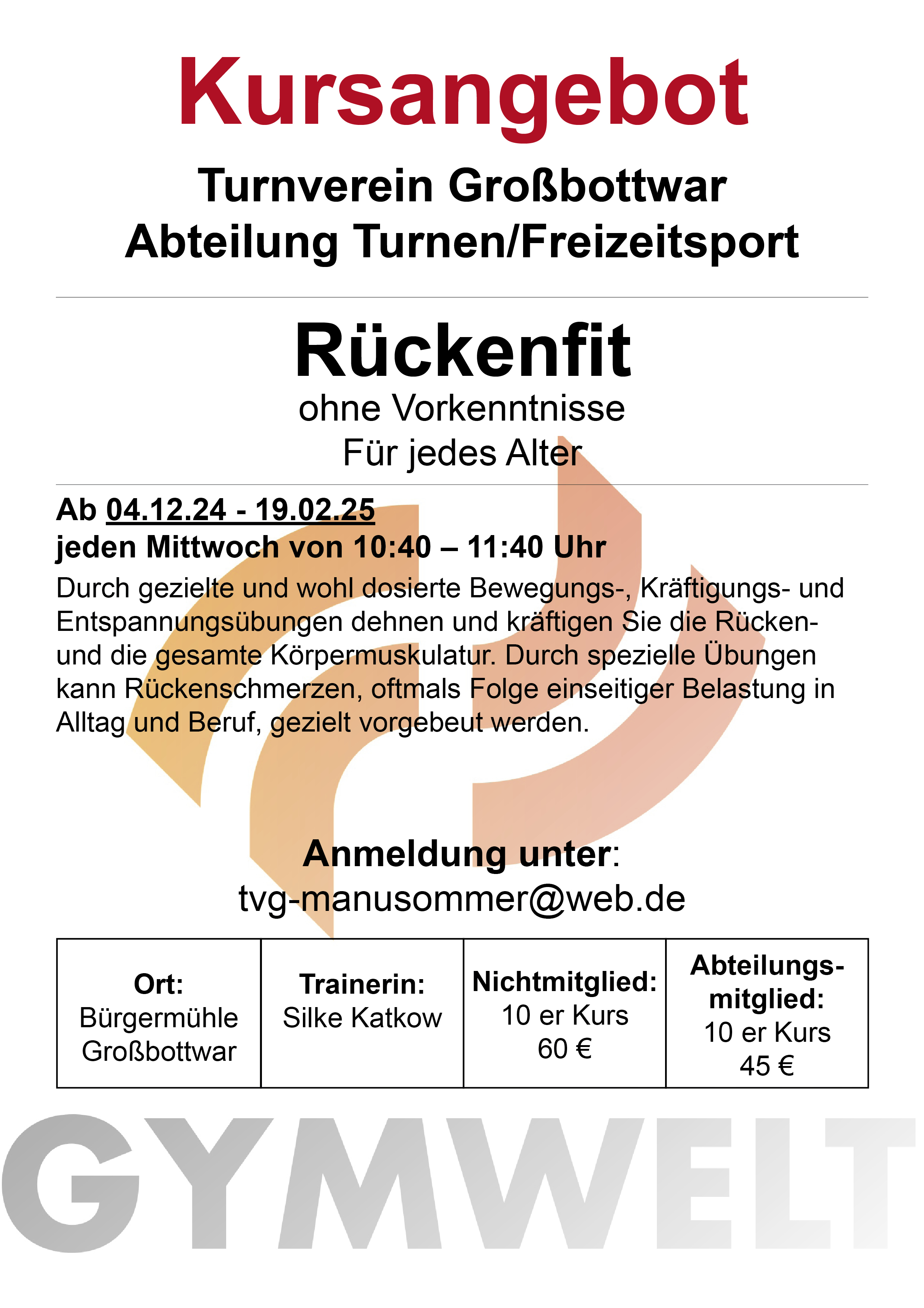 Durch gezielte und wohl dosierte Bewegungs-, Kräftigungs- und Entspannungsübungen dehnen und kräftigen Sie die Rücken und die gesamte Körpermuskulatur. Durch spezielle Übungen kann Rückenschmerzen, oftmals Folge einseitiger Belastung in Alltag und Beruf, gezielt vorgebeut werden.